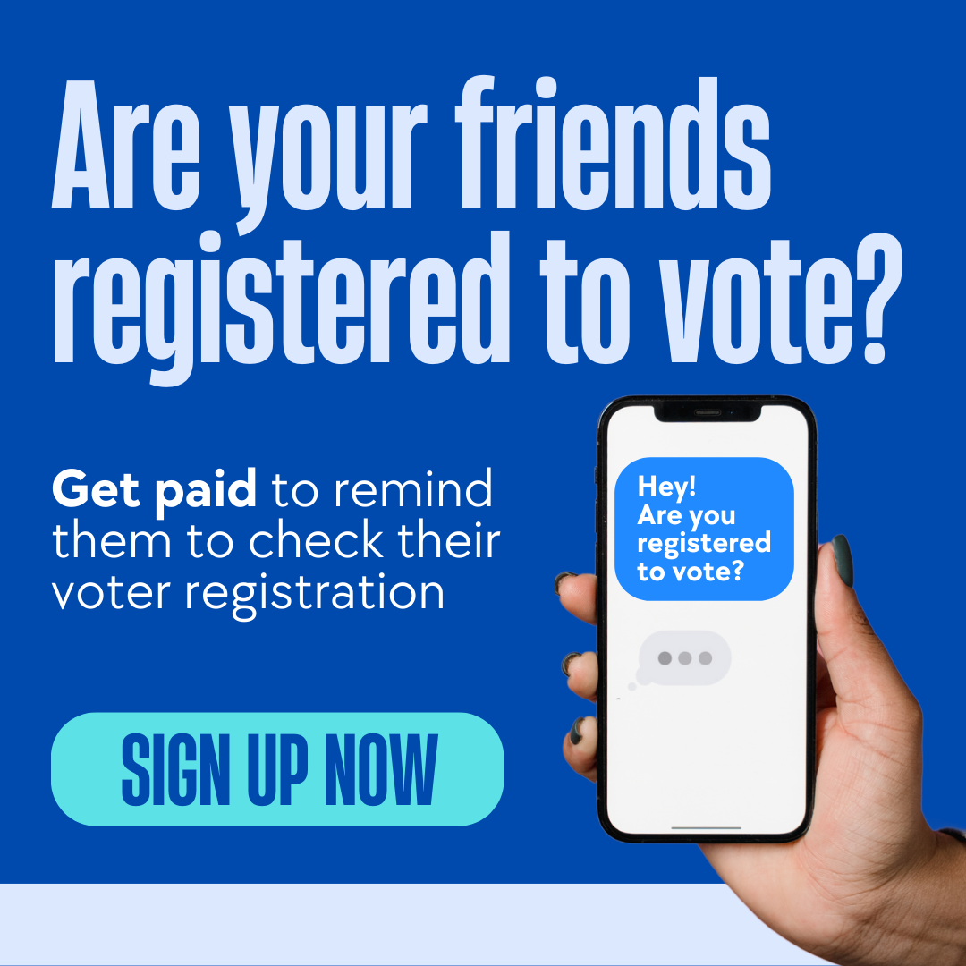 Earn up to $35 by texting your friends to encourage them to register to vote!Note: you must be under 30 and registered to vote. Click here to verify your registration - and register if needed.